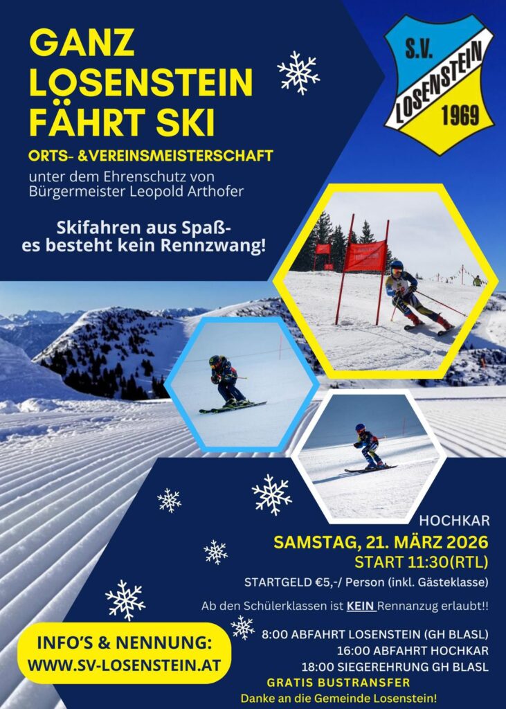 Am Samstag, 21. März 2026 findet der heurige Ortsskitag mit Orts- und Vereinsmeisterschaft statt.